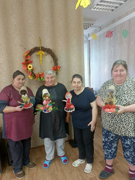 Отдыхающие отделения дневного пребывания изготовили осенний топиарий "Парящая чашка".